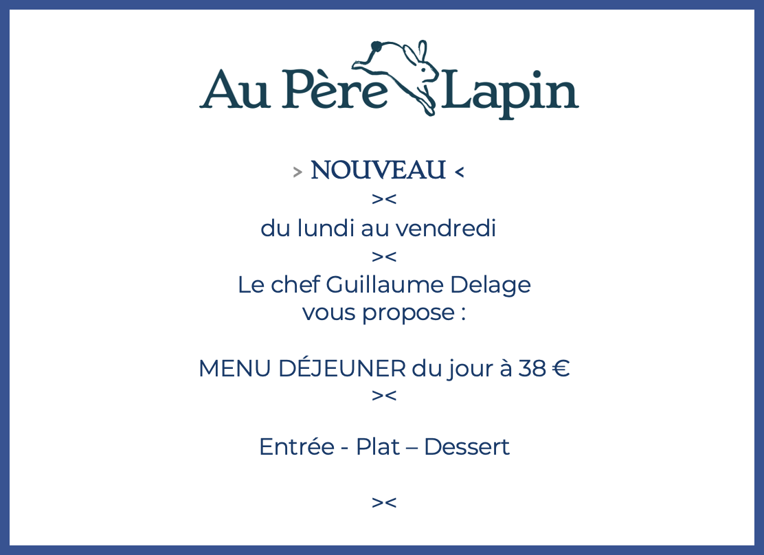 Aux Portes de Paris, à quelques minutes de l'Arc de Triomphe, dans cette belle maison, accrochée aux collines de Suresnes, surplombant la tour Eiffel, officie l’équipe du Père Lapin. Cette véritable institution, née en 1861, fête ses 160 ans cette année, sans avoir perdu l’entrain de sa jeunesse. Les propriétaires y veillent avec soin. Johann Caillot par son accueil chaleureux et son œil en salle vigilant, et le chef Guillaume Delage, prêt à célébrer, toujours avec autant de soin, cette cuisine gourmande et créative qui connaît ses classiques.